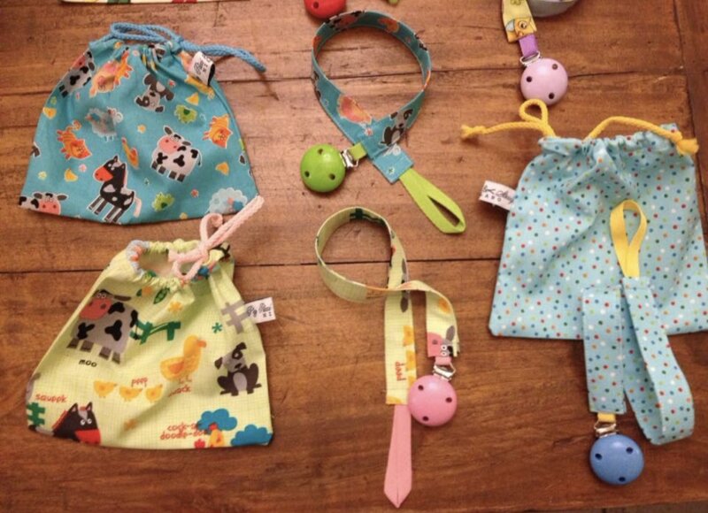 Porta ciuccio in stoffa con gancio in legno smaltato con vernice atossica ed a normativa CE.